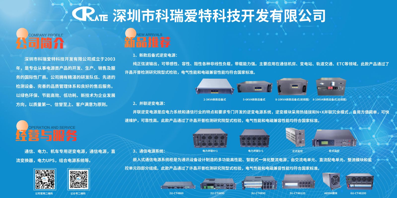 深圳市科瑞爱特科技开发有限公司(简称:科瑞爱特)成立于2003年,是一家专业从事电源类产品的开发、生产、销售及服务的国际性厂商。目前公司的主导产品有逆变器、通信电源、直流变换器和UPS四大类,产品广泛应用于大中型电厂、变电站、治金、石化、纺织、铁路、交通、金融、移动、联通等各个领域。公司电源产品已遍布全国乃至全球的每个角落,为数以万计客户的重要用电设备提供可靠、稳定的电源。
