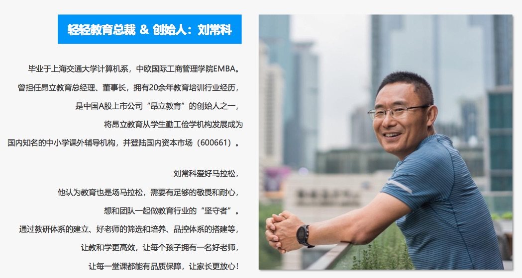 轻轻教育,成立于2014年,由国内知名的教育机构好未来和国际知名投资机构红杉资本、IDG资本、挚信资本等联合投资,是专注于全国中小学在线1对1全科辅导的互联网教育独角兽企业。目前,轻轻已经成长为一支拥有近60所分公司的庞大队伍,拥有超万名优秀教师储备库,同时,教研团队编撰制作了超50000份课件,全面覆盖中小学各年级、各学科,已为全国600座城市的百万家庭提供超过千万小时的教学服务。