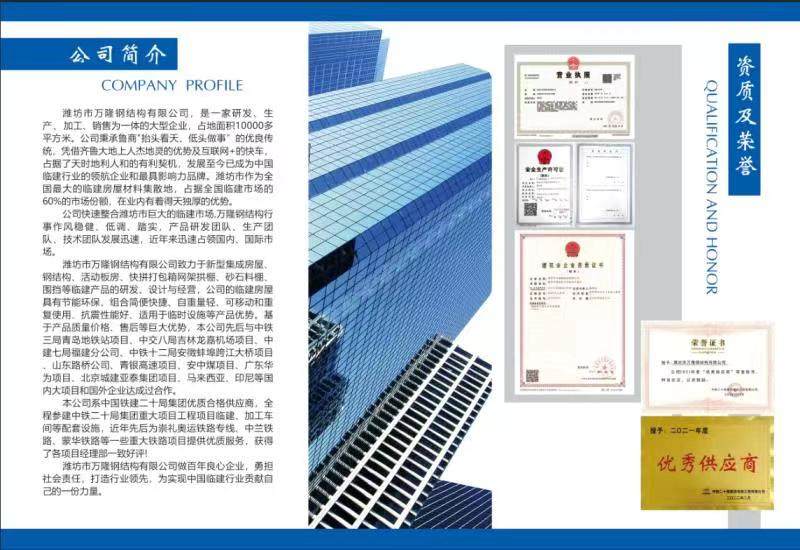 潍坊市万隆钢结构有限公司,是一家研发、生产、加工、销售为一体的大型企业,占地面积10000多平方米。公司秉承鲁商"抬头看天、低头做事”的优良传统,凭借齐鲁大地上人杰地灵的优势及互联网+的快车,占据了天时地利人和的有利契机,发展至今已成为中国临建行业的领航企业和最具影响力品牌。潍坊市作为全国最大的临建房屋材料集散地,占据全国临建市场60%的市场份额,在业内有着得天独厚的优势。公司快速整合潍坊市巨大的临建市场万降钢结构行事作风稳健、低调、踏实,产品研发团队、生产团队、技术团队发展迅速,近年来迅速占领国内、国际市场。潍坊市万降钢结构有限公司致力干新型集成房屋、钢结构、活动板房、快拼打包箱网架拱棚、砂石料棚、围挡等临建产品的研发、设计与经营,公司的临建房屋具有节能环保、组合简便快捷、自重量轻、可移动和重复使用、抗震性能好、适用于临时设施等产品优势。基于产品质量价格、售后等巨大优势,本公司先后与中铁三局青岛地铁站项目、中交八局吉林龙嘉机场项目、中建七局福建分公司、中铁十二局安徵蚌埠跨江大桥项目、山东路桥公司、青银高速项目、安中煤项目、广东华为项目、北京城建亚泰集团项目、马来西亚、印尼等国内大项目和国外企业达成过合作。本公司系中国铁建二十局集团优质合格供应商,全程参建中铁二十局集团重大项目工程项目临建、加工车间等配套设施,近年先后为崇礼奥运铁路专线、中兰铁路、蒙华铁路等一些重大铁路项目提供优质服务,获得了各项目经理部一致好评!潍坊市万隆钢结构有限公司做百年良心企业,勇担社会责任,打造行业领先,为实现中国临建行业贡献自己的一份力量。