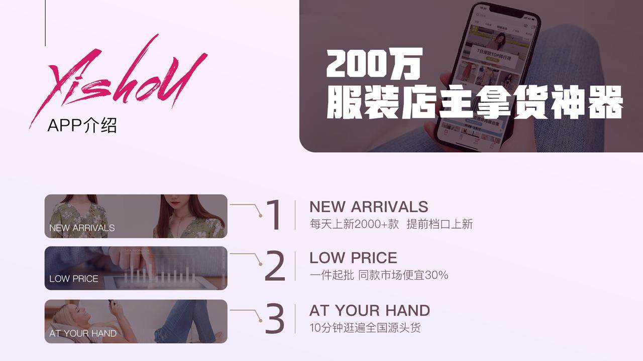 【一手服装批发】 是专注于服装批发的b2b平台,由专业的买手团队整合全国一级批发市场的最新热门款式,以“一手货源,一件起批”的业务模式为全国线下服装店主提供更省心、更省钱、更省力的专业购货服务。