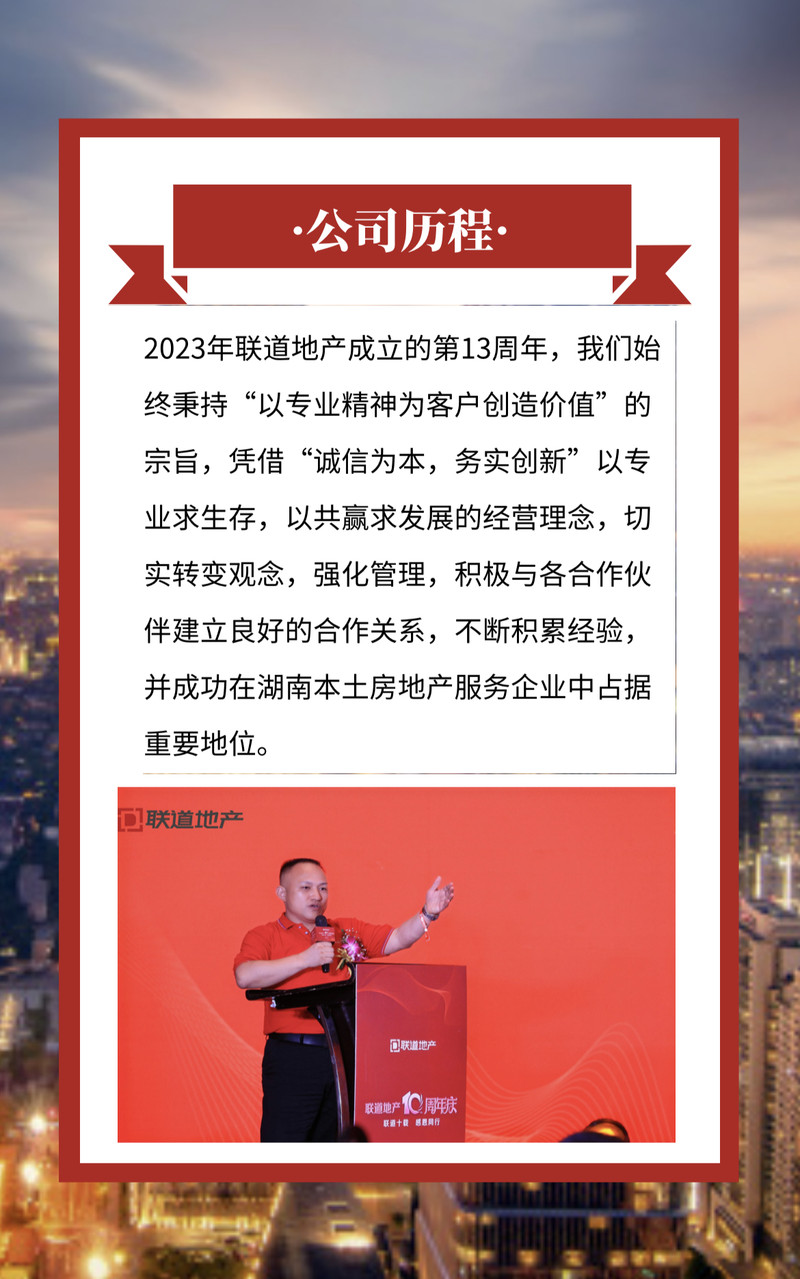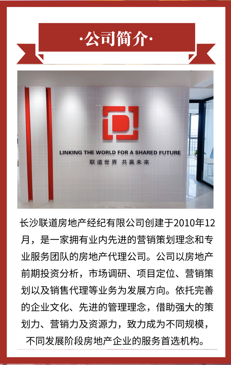 长沙联道房地产经纪有限公司创建于2010年12月,是一家拥有业内先进的营销策划理念和专业服务团队的房地产代理公司。公司以房地产前期投资分析、市场调研、项目定位、营销策划以及销售代理等业务为发展方向,依托完善的企业文化、先进的管理理念,借助强大的策划力、销售力及资源力,致力成为不同规模、不同发展阶段房地产企业的服务首选机构。
