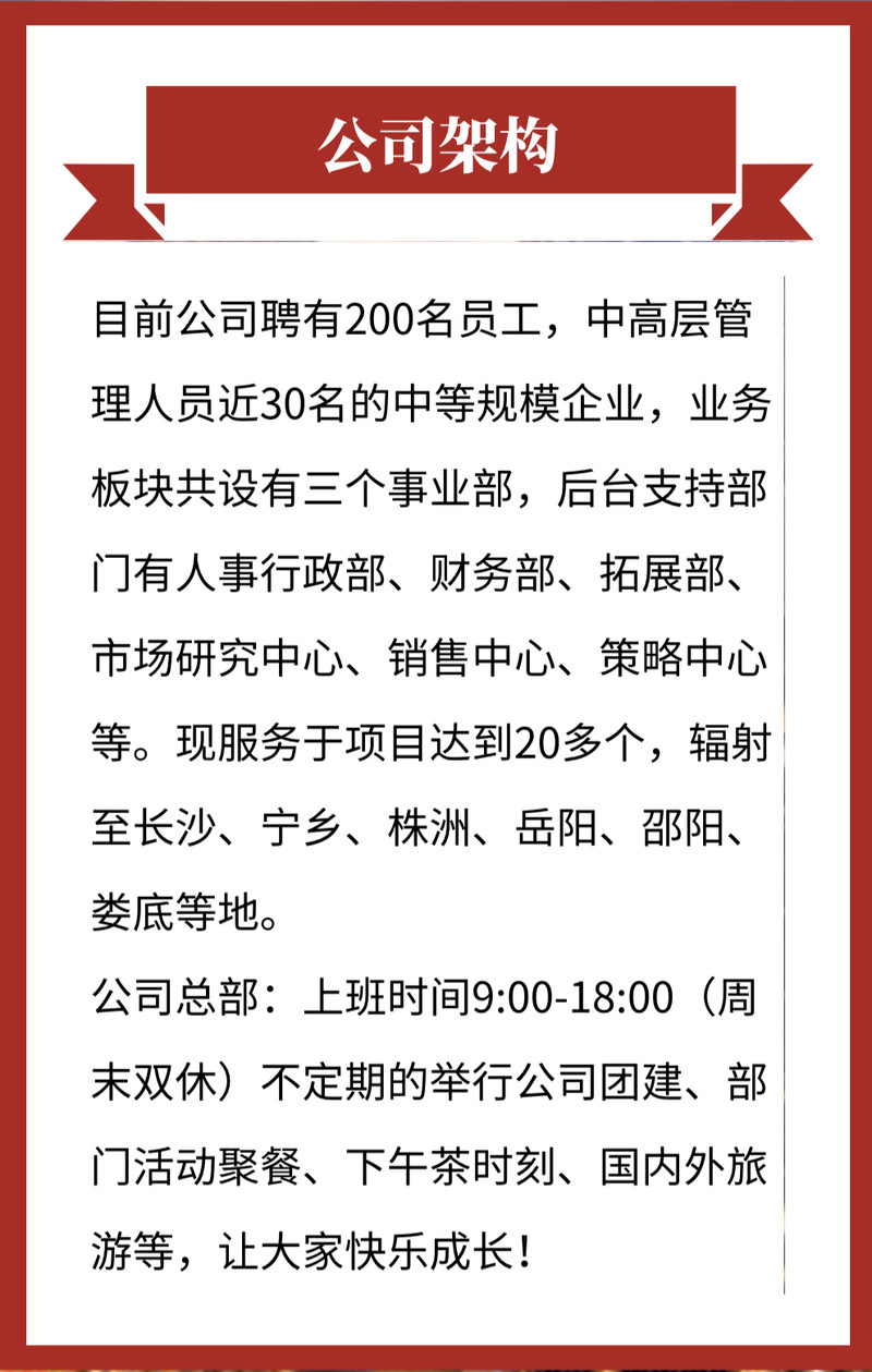 联道地产以服务长沙为业务发展核心,辐射湖南各地市,逐步面向全国拓展。目前,已与香港乐万邦、中国建筑总公司、绿地集团、广晟集团、金科集团、叁一集团、兴旺集团、和顺集团、湘银集团、中欣集团、金岸集团、宏聚地产、标志地产、神祺地产、天祺地产等国内外知名地产品牌开发企业形成合作伙伴关系。叁年来公司业务蓬勃发展,已成为湖南省内享有盛誉的营销策划和销售代理公司,目前聘任有200名员工、中高层管理人员近30名的中等规模企业,业务板块共设有四个事业部,后台支持部门有人事行政部、财务部、拓展部、市场研究中心、销售中心等。业务能力处于快速发展阶段,现服务项目达25个,辐射至长沙、宁乡、株洲、岳阳、邵阳、娄底等地。