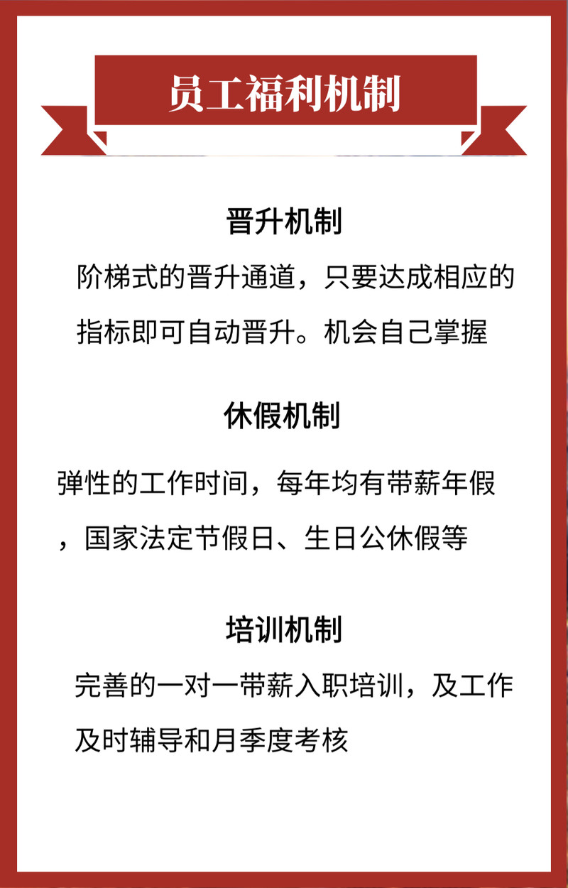 现因公司规模不断壮大,现向社会招揽各类人才,一经录用待遇从优(公司为员工购买社保、各种节假日福利,开展各类旅游活动,完善的年假制度等相关福利)。