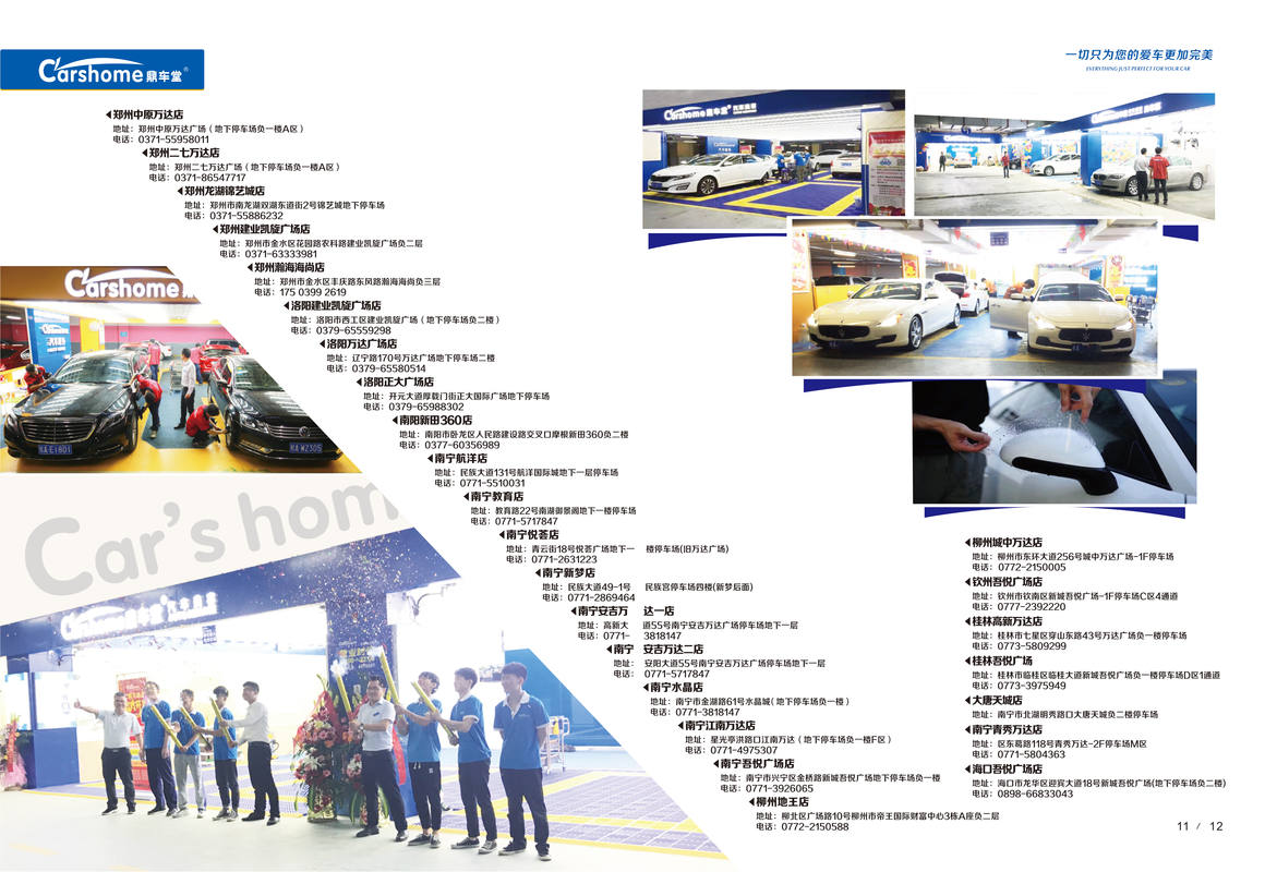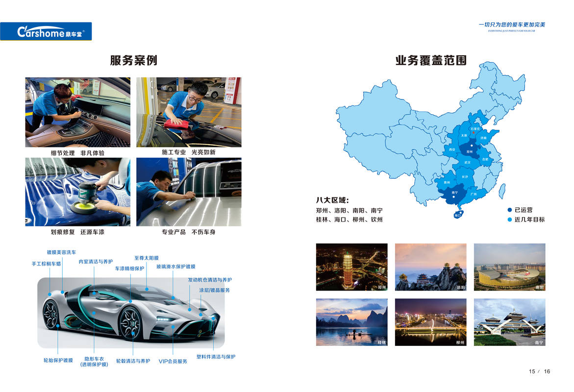 鼎车堂汽车服务有限公司(以下简称;鼎车堂)于2011年成立,目前占领3省区域35家分店,具备南方,北方,双向快速发展的优势,分别为河南省,广西省,海南省,鼎车堂定位中高端客户群体,专注商业中心地下停车场汽车美容服务。位于全国汽美排名前五,与近30家高等院校合作,获得校方、家长及学生的一致好评,荣获“金牌校企合作单位”。公司熟练掌握快速精洗,漆面镜面养护,车厢内室护理,封釉镀膜,镀晶,车衣贴膜,改色装饰,等技术,同时拥有从业经验丰富的团队,及一整套成熟的操作管理流程,确保服务品质标准化,是郑州市场上管理最规范的地下停车场汽车美容服务中心。目前公司在郑州二七万达广场,中原万达广场,郑州建业广场,瀚海海尚商场,新郑龙湖锦艺城广场,洛阳万达广场,洛阳建业凯旋广场,洛阳正大国际广场,南阳市新田360广场。南宁江南万达广场,南宁安吉万达广场,南宁梦之岛水晶城,海口新城吾悦广场等开设了35家分店,公司发展呈稳步增长态势。