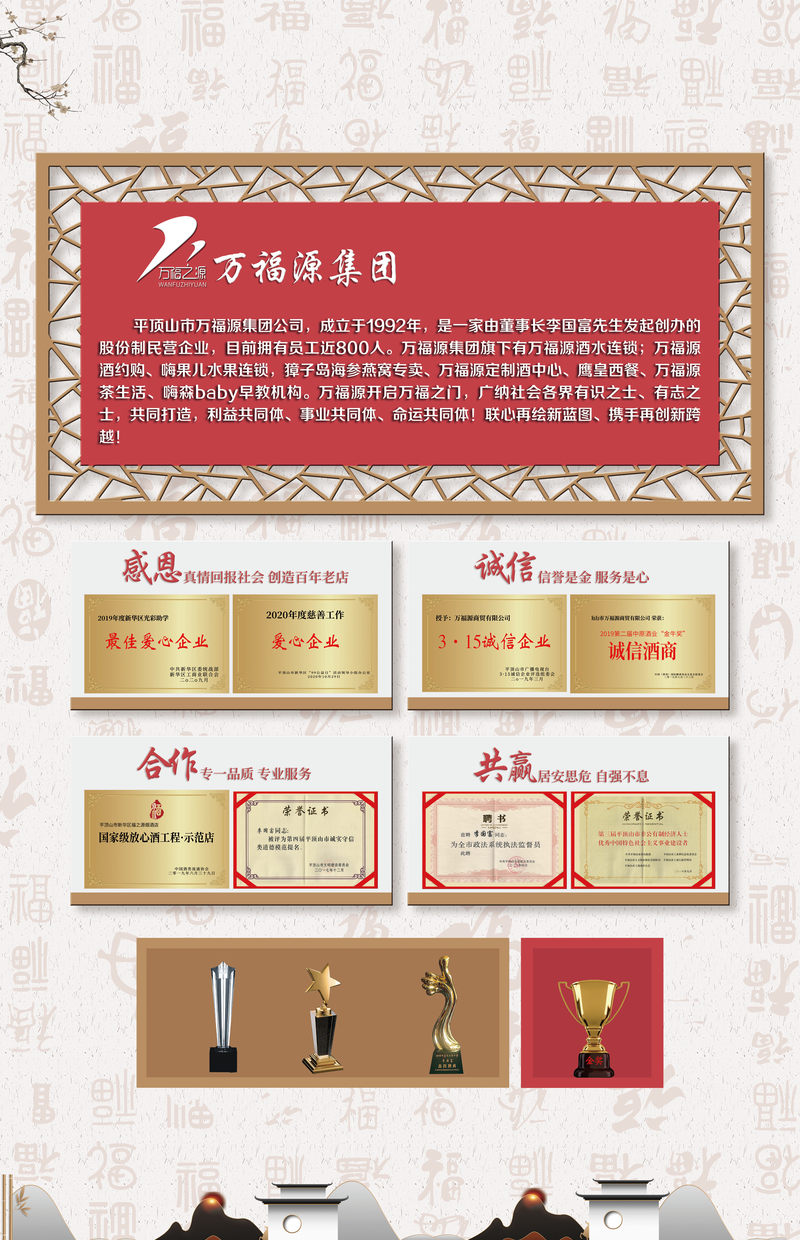 三十余年的风雨历程,万福源从1992年的一个小店发展成为多元化、集团化的公司,并在国家工商局注册了“万福之源”的商标。万福源秉承以人为本,器重人才,秉承“诚心、团结、奉献、创新”的精神,努力创造“服务体现真诚”的企业文化,树立良好的企业形象,走可持续发展的道路。前进永无止境,完善是公司的追求,以平价、真品、快捷、务实、高效、创新为宗旨,把“万福源”打造成一块金字招牌,以便更好的服务于社会。我们以“真情服务社会,创造百年老店”的远大目标,踏踏实实,一步一个脚印的发展壮大,赢得社会各界的认可。