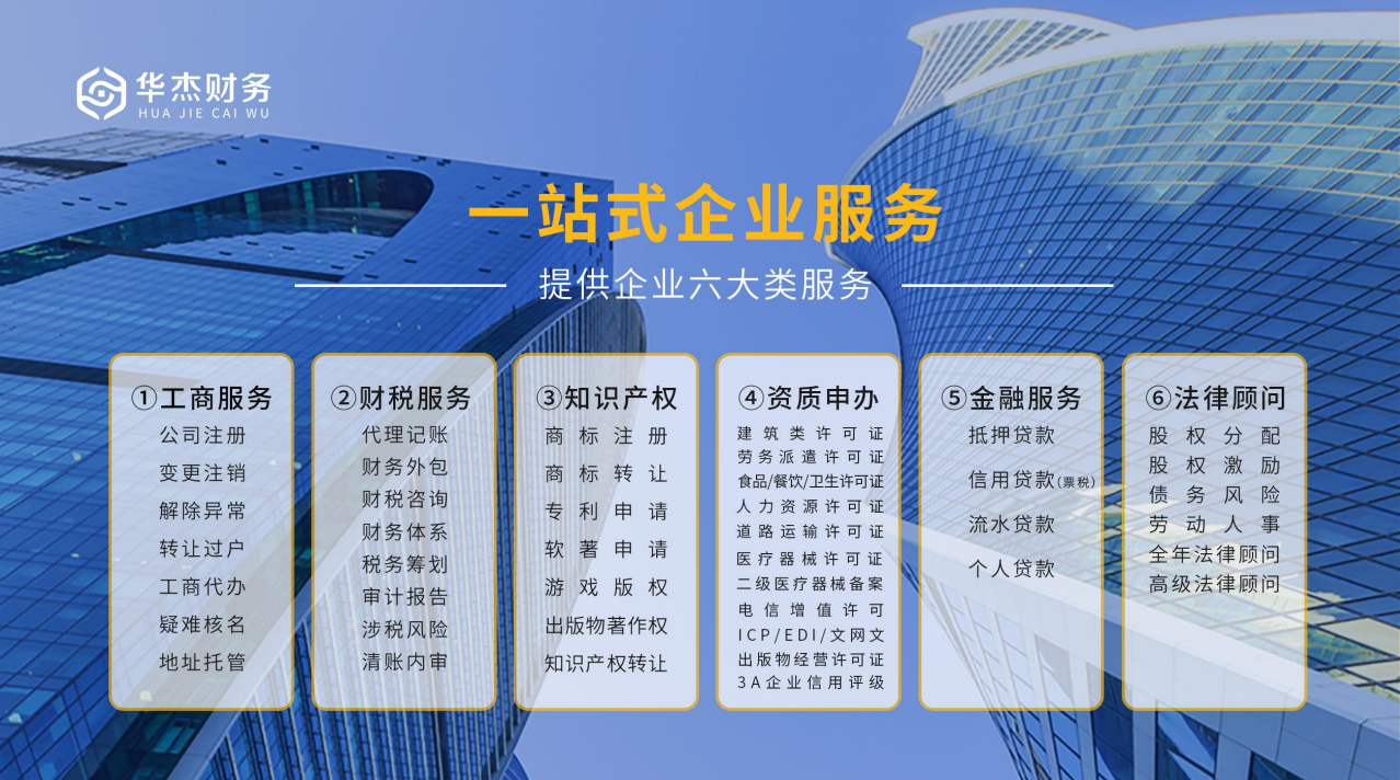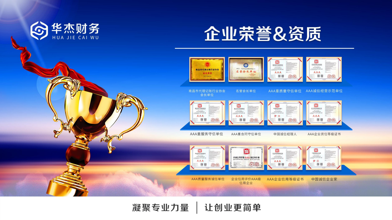 华杰集团公司简介江西华杰财税服务集团有限公司(以下简称:华杰财税集团)于2021年6月成立,品牌、服务全面升级,集团旗下拥有江西华杰财务管理有限公司、江西华杰税务师事务所有限责任公司、江西华杰国际知识产权代理有限公司、南昌华杰会计师事务所、江西华杰企业管理咨询有限公司的、江西华杰法律咨询有限公司、江西杰华人力资源有限公司等,业务涵盖企业财税服务、工商服务、资质许可、知识产权、人资服务、法律服务、金融服务七大类,包括代理记账、公司注册、变更注销、内账外包、商标专利、资质许可、政府项目申报、产业园区返税、财税咨询、税收筹划、高企认定、审计、税审、人事社保、学历提升、法律服务、金融服务等近500多种企服项目实现企业全生命周期闭环服务。华杰财税集团前身为江西华杰财务管理有限公司,十四年风云砥砺,总部在南昌,是经南昌市财政局批准设立的财税机构,南昌市代理记账行业协会会长单位,企业信用评级3A级企业,CCTV中国优选品牌,目前企业服务分子公司10余家,会计师相关人员200余名,其中入司3年以上的100余人,具有专业技术职称与各类资质人员如会计师、注册会计师、高级会计师、注册税务师、高级律师等,已成为江西领先财税服务品牌。华杰财税集团,秉承“自立立他,德行天下”的企业核心价值观,坚持“追求卓越,尽善尽美”的企业服务宗旨,传承“尊重价值、以人为本、人尽其才”管理理念,在代理记账、财务外包等产品方面拥有品牌化、专业化、规模化优势,形成了以工、商、财、税、法等服务为主的产业链。致力打造成为品牌实力雄厚的财税一体化智能财税集团,为中大型企业和中大型提供智能财税服务,助力企业数字化发展!