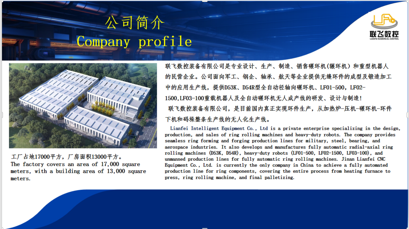 济南联飞数控装备有限公司是高新技术企业、专业设计、生产、制造、销售碾环机和重型机器人的民营企业。公司成立于2017年,现有技术骨干20人,研究生1人,本科生16人,专科生2人,1名山东大学专家教授。公司面向军工、钢企、轴承、航天、车辆、钢贸等企业提供无缝环件的成型及锻造加工中的应用生产线,提供D53K、D54R型全自动径轴向碾环机、D55R型数控全自动辗环机、LF01-500,LF02-1500,LF03-100重载机器人及全自动碾环机无人成产线的研发、设计与制造! 济南联飞数控装备有限公司,是目前国内唯一实现环件生产,从加热炉-压机-碾环机-环件下机和码垛整条生产线的无人化生产线。该生产线全线无人,实现多规格、多型号、多材质的连续化流水生产,用户使用情况良好并得到行业的认可。