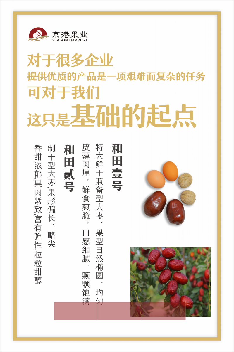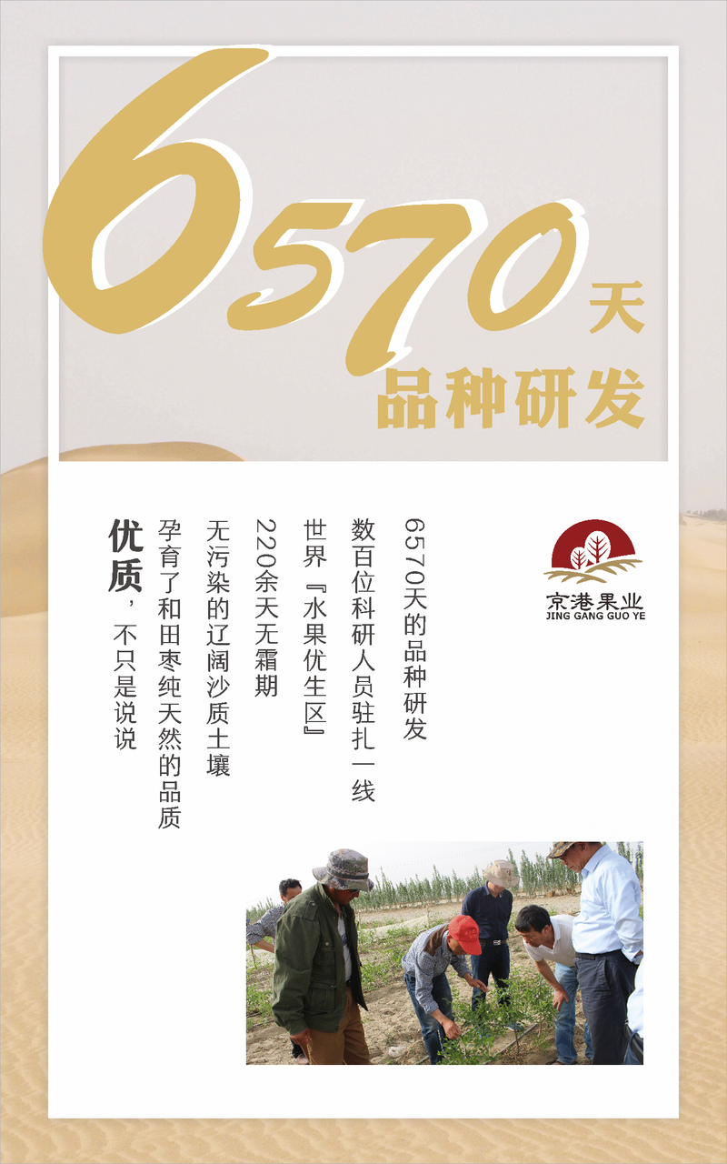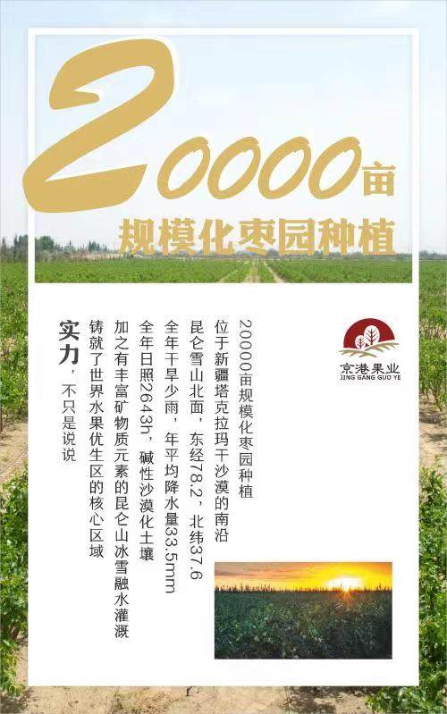和田京港果业开发有限公司(简称京港果业)于2015年2月2日成立,注册资本5000万,注册地址位于新疆和田地区和田县高新农业经济新区。是综合开发、农业开发、沙漠治理、果林研究、特色果品种植加工于一体的大中型农业综合型企业。 目前,在果园建设方面已实施阶段性投资1.7亿余元,阶段性完成10741亩沙田(总面积近20000亩沙田)改造建设,是全国枣业公司唯一规模化、标准化、系统化种植的万亩枣园。 销售公司位于河南郑州郑东新区。招聘人员上班地点位于郑州。