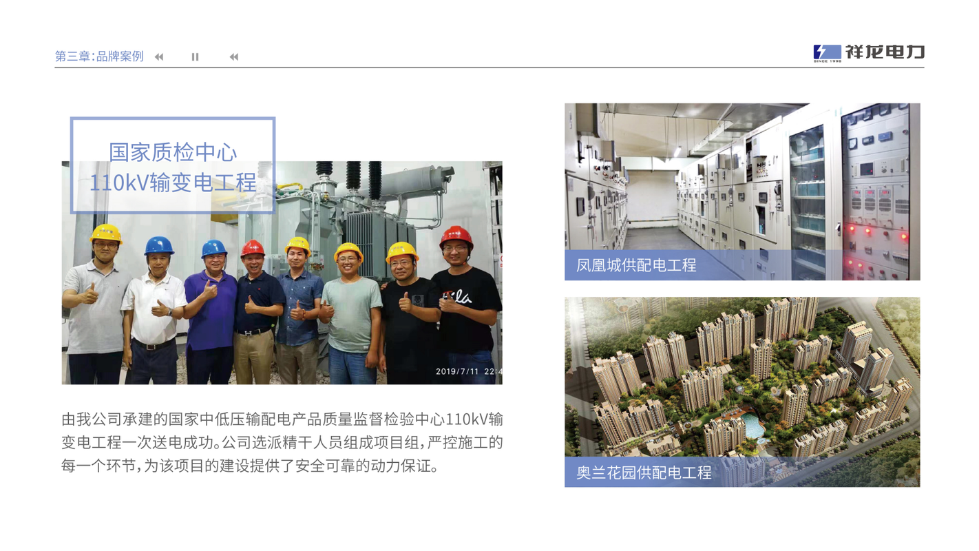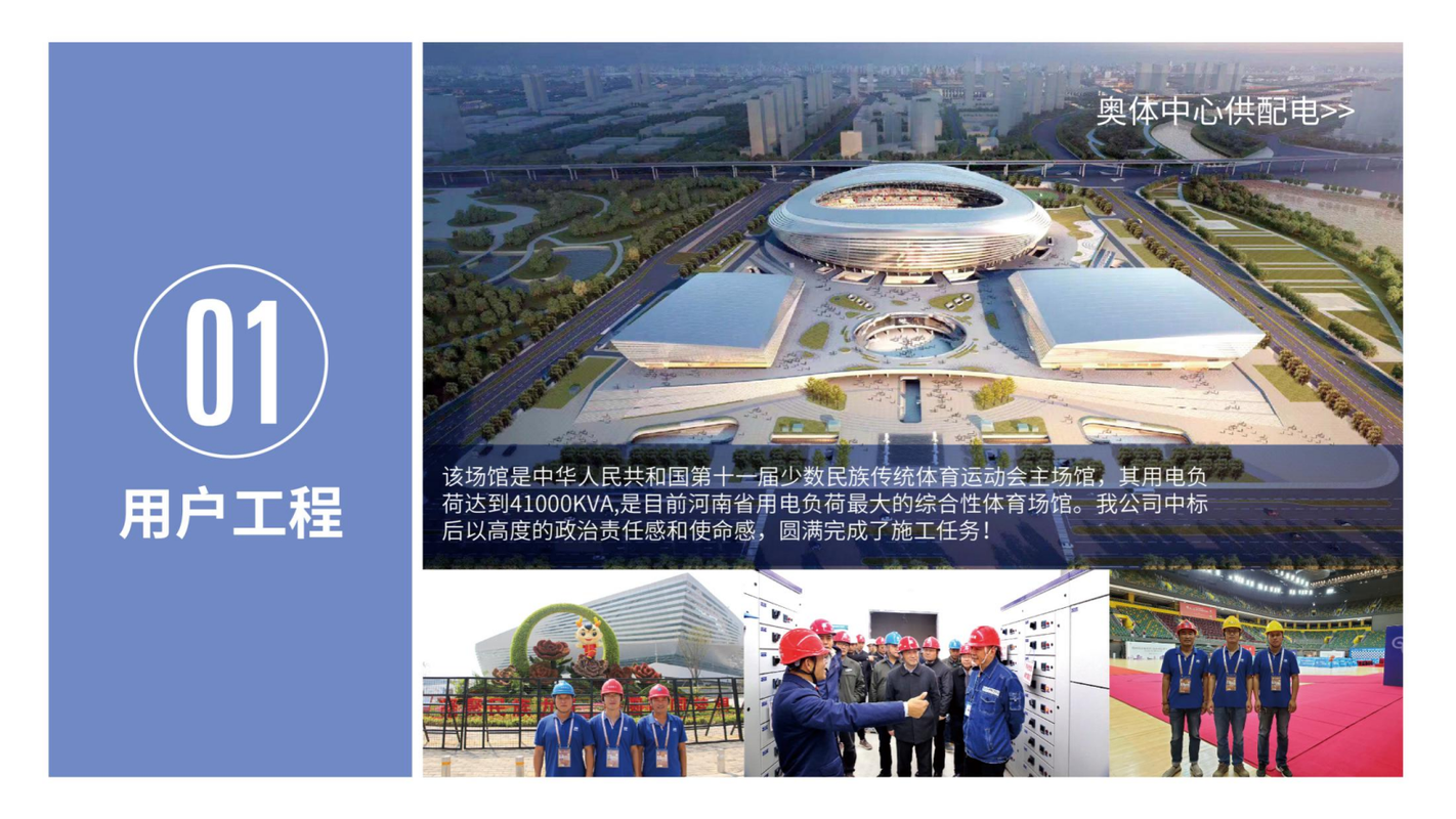 2016年我公司被河南省总工会授予工人先锋号荣誉称号,同年4月21日,公司在全国中小企业股份转让系统挂牌。证券简称:祥龙电力,证券代码:836287。公司拥有专业化的管理团队、施工队伍和运行维护队伍,核心团队成员稳定,且均具有丰富的项目管理经验和现场施工经验。公司主营业务分为用户工程、电网工程、新能源建设和智能运维四大板块,先后参与建设了郑州新郑国际机场供配电工程、郑州奥体中心供配电工程、国网河南省电力公司县域大修、技改项目、辉县及范县光伏扶贫工程、中广核蟒川风电项目等。电力运行维护团队拥有先进的在线监控和维护设备,运行维护人员均具有专业资质以及对供电设备设施远程监控、日常维护、应急救援和接受重要任务时保障供电的职业素质,承担了郑州新郑国际机场航空变、郑州市金水区政府配电室等运维项目。带电清洗是我公司纵向一体化发展战略下的高科技项目,技术和产品获得了两项国家发明专利。