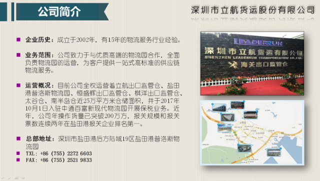 深圳市立航货运股份有限公司成立于2002年,在物流行业拥有十五年以上的服务经验,公司致力于与优质高端的物流园合作,全面负责物流园的运营,为客户提供一站式服务。