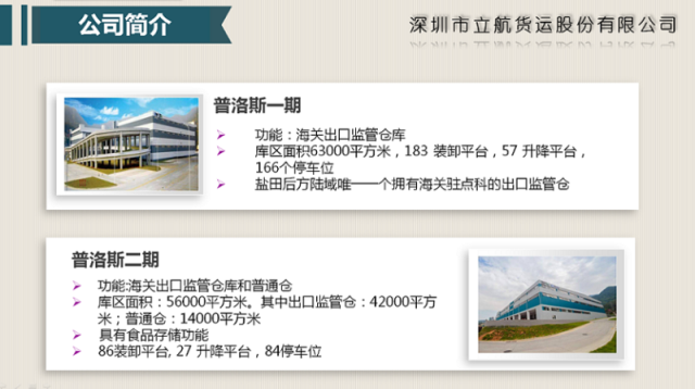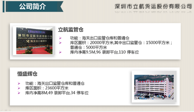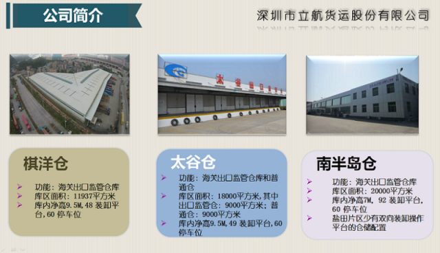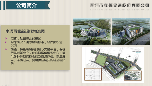目前,公司全权运营着立航出口监管仓、盐田港普洛斯物流园、恒盛辉出口监管仓、棋洋出口监管仓、太谷仓、南半岛仓近25万平方米仓储面积,并于2017年10月1日入驻中通百富新现代物流园开展保税业务,未来公司将在跨境电子商务、供应链金融等业务上拓展。