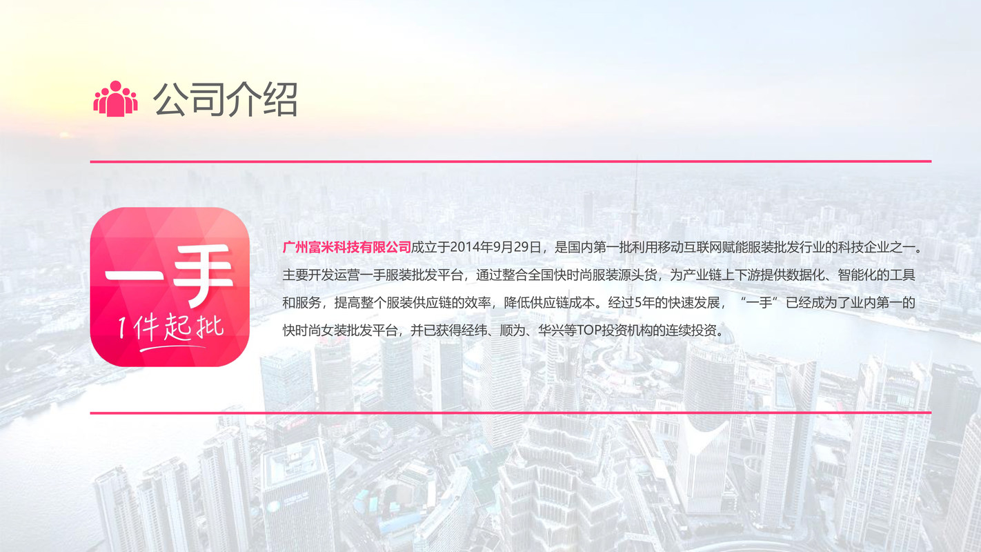 服装行业拥有万亿级的市场空间,一手作为服装产业互联网的开拓者,目前已发展成为汇聚全球服装好货好档口的智慧批发平台,处于市场地位,并获得多家全球资本的青睐: