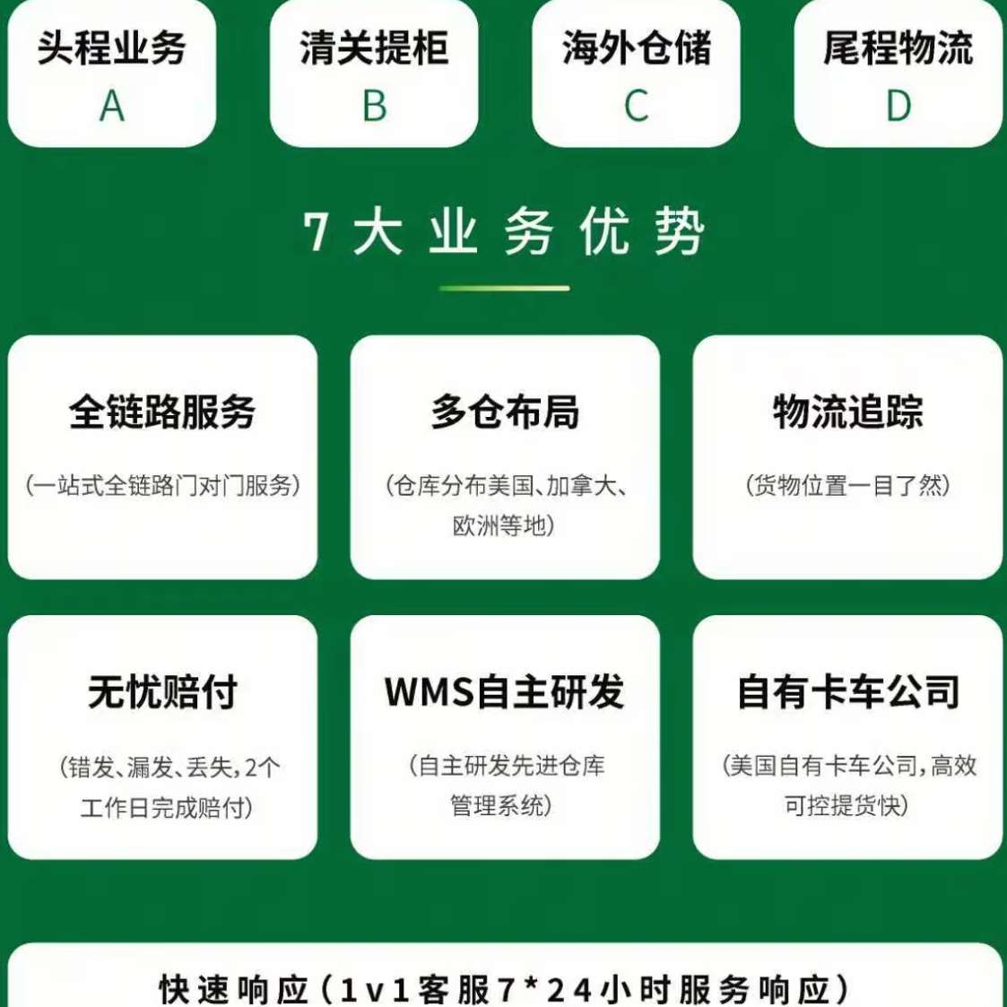 大榕树是专业的全球供应链服务专家。公司专注于全球供应链服务近十年,凝聚了知名科技企业的技术专家、供应链管理专家,以及全球亚马逊资深运营专家,自主研发了技术领先的仓储管理系统。深圳、上海、成都等地设立公司,并在国外设立了美国公司、加拿大公司和欧洲公司,全面覆盖全球供应链业务,助力中国制造通向全球。我们的产品1.头程+关务服务海运整柜优势大,可优化申报流程,提供专业的关务咨询;2.提拆派一体化服务在CA,NJ,TX,SAV码头,有自营拖车公司,支持整柜直送。并配有专业转运仓点,全面覆盖FBA转运、商卡、私人地址等快速中转服务;3.仓储服务除支持小件+中大件常规一件代发业务外,也支持其他客户需要的定制化服务;4.尾程派送服务本地快递实现全重量段覆盖,低价稳定。LTL和FTL卡派可覆盖全美,支持白手套服务。6大优势:1.一站式服务头程、提柜、仓储、尾程配送多场景多渠道全链条服务。2.自有卡车公司在CA,NJ,TX,SAV设有码头提柜车队,并配备53尺,30尺,26尺等多型号卡车,长途干线与LOCAL派送精密结合。3.多仓点布局仓点多,面积大,范围广,业务细分到仓,设有转运拆柜仓,小件仓,中大件仓,退件仓等专业仓。4.优势账号尾程快递渠道多,折扣好,高达90%折扣,正规安全。5.技术保障公司⾃主研发的系统,已与各种行业主流系统对接。6.履约稳定系统下单后当日极速核验发货,48小时内上网率高达99%,精准高效,全程无忧。服务特色大榕树在美国洛杉矶、休斯顿、萨凡纳、芝加哥、新泽西,加拿大温哥华、多伦多,德国北威州、英国曼彻斯特等地设有海外仓,总面积近380万尺。1.门到门一站式服务覆盖欧美全境的头仓配一体化服务,实现“一票到底”与闭环运输,全程可控。2.灵活定制库内支持各种定制化服务,包含贴换标、检测、翻新、维修,大件设备组装等,为跨境卖家降低运营成本保驾护航。3.快速响应自控仓点高达30多个,由专业的仓库管理团队统一管理,可快速响应客户各类定制化需求。4.本地化支持全球配置白、晚班客服团队,提供7*24小时不间断一对一服务,让跨境卖家更安心。
